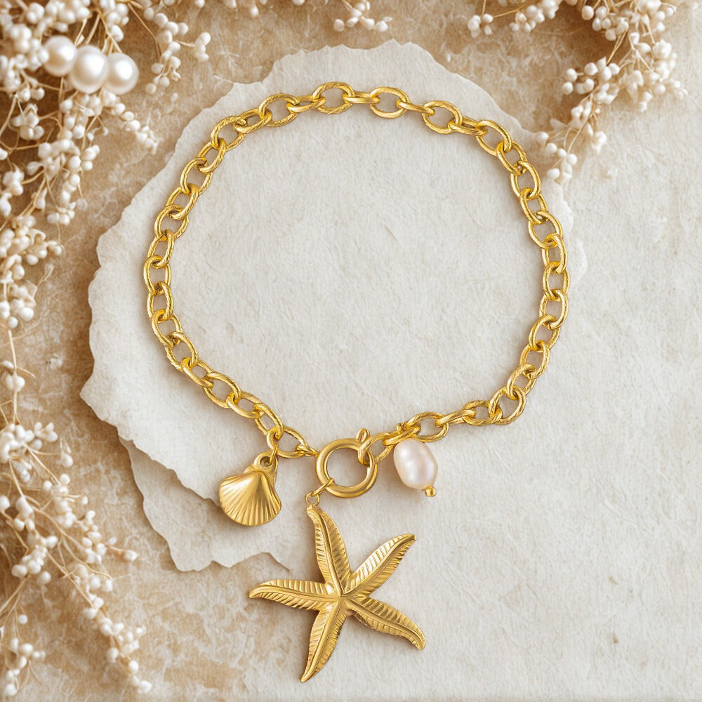 Prix régulier €14,00Prix soldé €14,00 Prix régulierPrix unitaire / parBracelet Charms Océan Bracelet aux inspirations marines avec pendentifs coquillages, cœur et étoile de mer. Description longue : Le Bracelet Charms Océan vous transporte en bord...