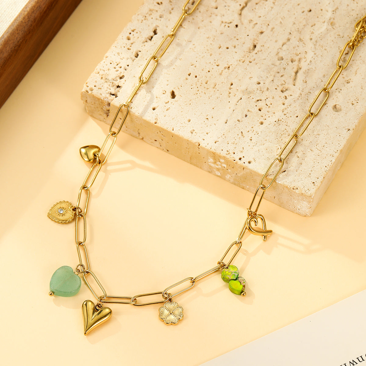 Prix régulier €20,00Prix soldé €20,00 Prix régulier €0,00Prix unitaire / parCollier Chaîne Dorée Grands Maillons et Breloques Cœurs, FleursDes maillons audacieux et des breloques romantiques.Ce collier statement marie de larges maillons dorés à des pendentifs en...